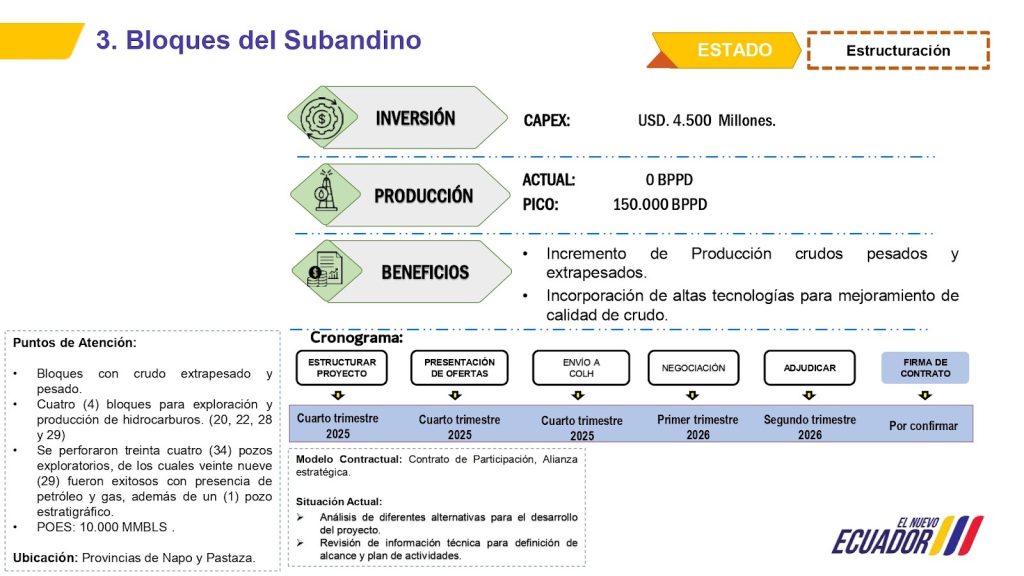Datos técnicos para los Bloques del Subandino, presentados por el Ministerio de Ambiente y Energía en el “Portafolio de proyectos Priorizados”, el 15 de agosto de 2025.